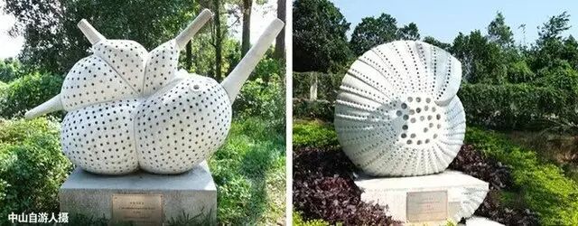 小琅环公园仙石径前,造型各异的有孔虫雕塑,错落有致分布在山坡上,这是由三乡镇政府与祖籍三乡的中国科学院院士郑守仪创办,集科学、艺术、海洋文化为一体的有孔虫公益型景观。