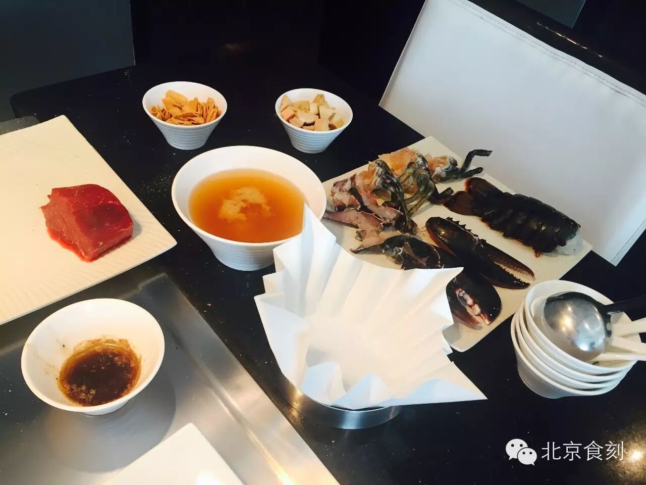最后的重头戏来了,也是这次无论从观赏还是味道上来说最高的菜品了!龙虾被分解成了几部分,几只小腿被放置在下图的那个白色纸中用一个钢圈套住煲汤。