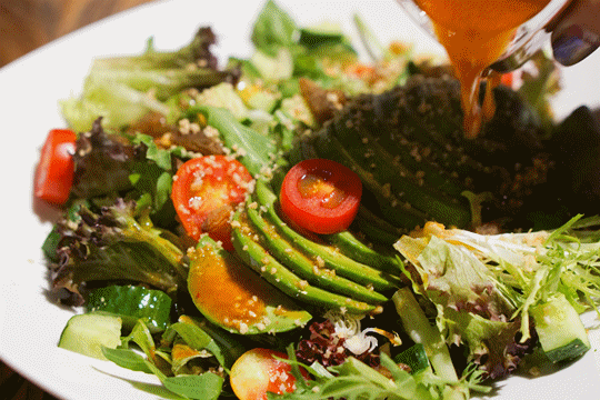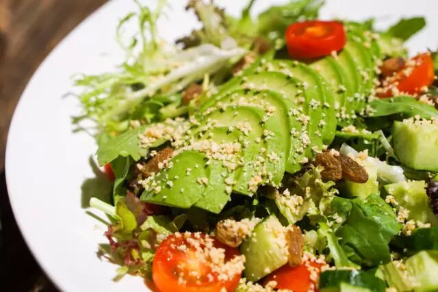 享用美味之余也要考虑健康~色拉中饱受好评的牛油果登场!一大半牛油果盖在搭配均衡的蔬菜拼盘上!