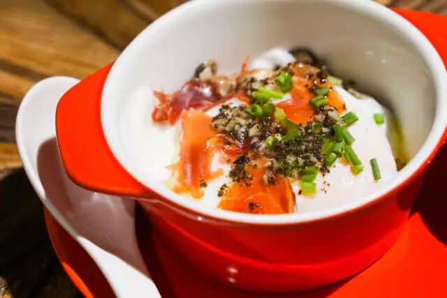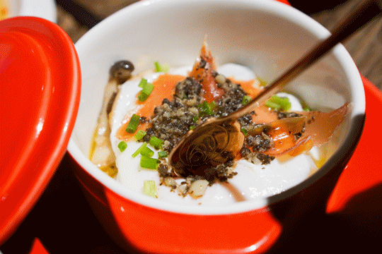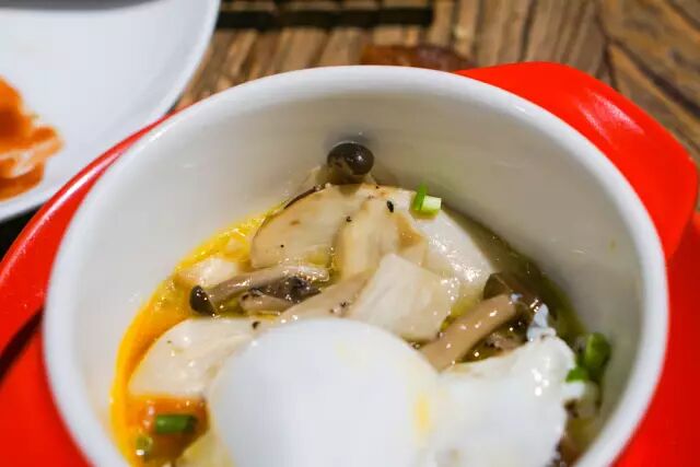 幸亏残留的理智把小编的魂拉回来,浓郁的黑松露酱还在回味ing,就给大家揭秘盖在温泉蛋下的丰富配料~3种鲜味菌菇把盏底满满地铺好啦!