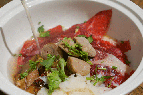 端上来的一缸河粉可把小编给震撼住了,掀开盖子一看:加拿大3A牛小排+澳洲M3和牛占据半壁江山!