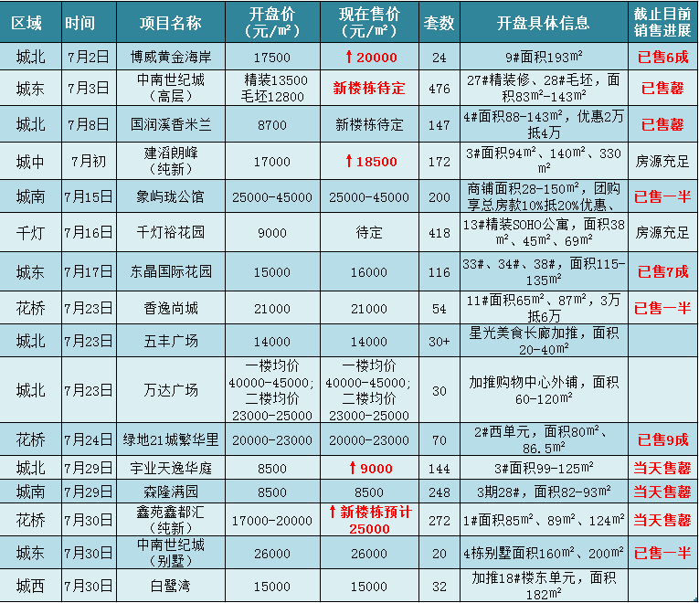 7月有15个项目开盘,而有5个楼盘新加推的房源已经售罄,其中三个更宣称当天已经全部卖完。就目前来看,购房需求仍然比较旺盛。