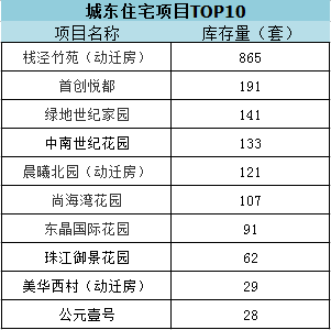 目前城东住宅存量确实不大,排名最靠前的蓬朗栈泾竹苑为动迁房,前十里面晨曦北园同样是动迁房,而普通商品住宅,库存量最大的首创悦都仅剩191套。