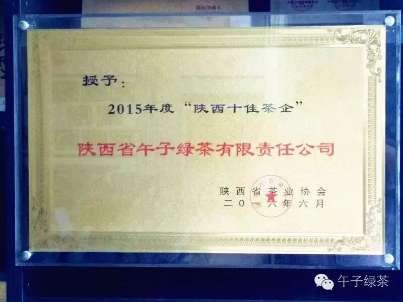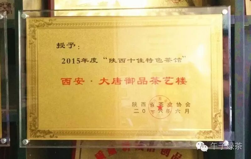2016年2月,为充分表彰、鼓励我省名优茶企、特色茶馆、茶学机构和为陕茶事业发展做出突出贡献的个人,陕西省茶叶协会决定在全省范围开展评选2015年度陕西茶行业“十佳茶人”、“十佳茶企”、“十佳特色茶馆”和“十佳茶学机构”的活动。经过茶友们为期一个月的踊跃投票,陕西省午子绿茶有限责任公司和大唐御品茶艺楼分获2015年度“十佳茶企”和“十佳特色茶馆”荣誉称号。