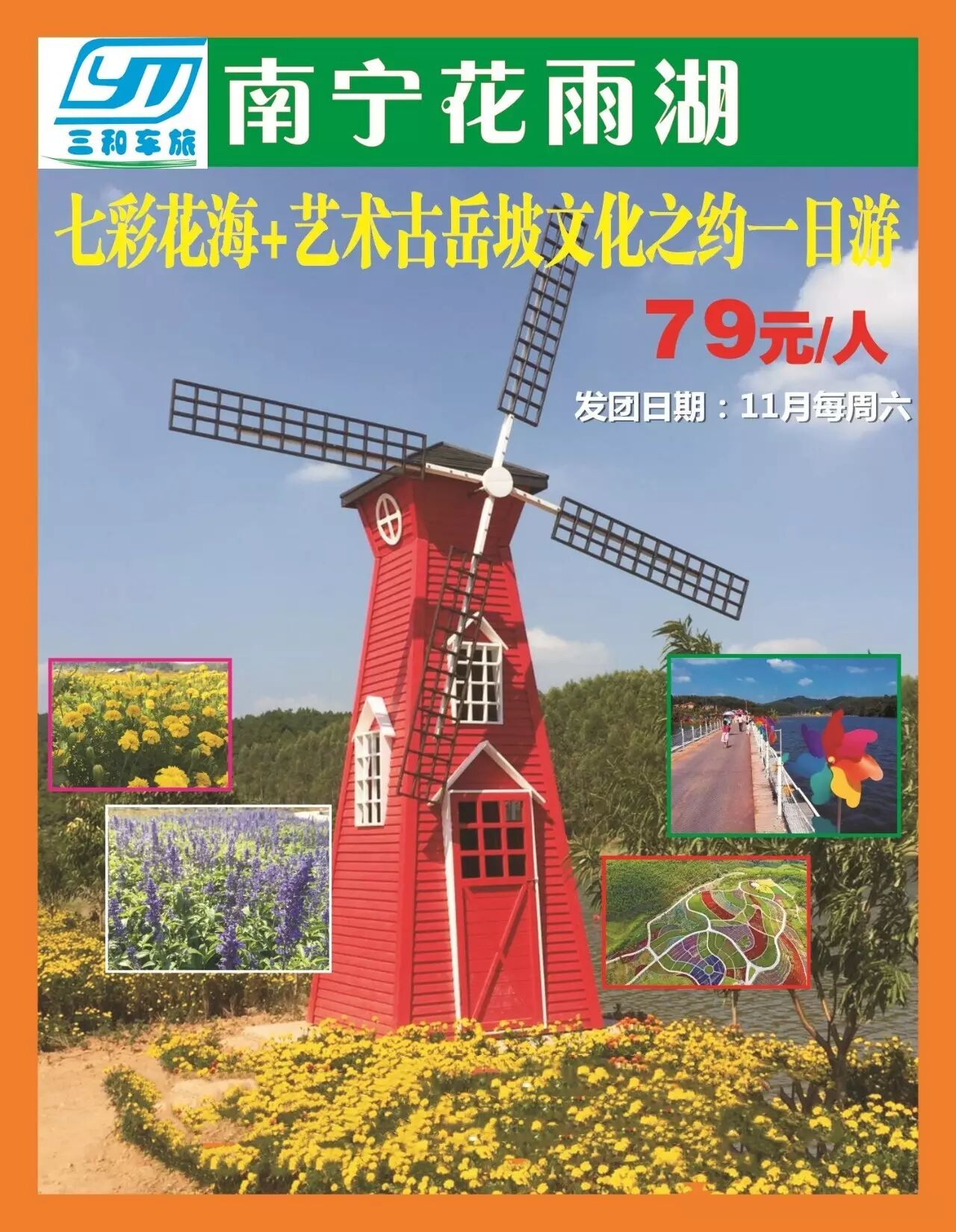 早上7:30于玉林旅游汽车客运站(原东郊车站)集合,8:00乘车(约2.5小时)前往花雨湖生态休闲旅游区。这个桃花源般的地方是广西著名音乐家古笛先生(《赶圩归来啊哩哩》词曲作者)的故乡,位于南宁市青秀区南阳镇。花雨湖就如同它的名字般,令人流连忘返。这里保留着原生态的山水风光。由千日红、向日葵、鸡冠花、鼠尾草、孔雀草、香彩雀等组成的“七彩花海”,在秋日的阳光下绽放开来,形成了一幅幅美丽的秋日画卷。