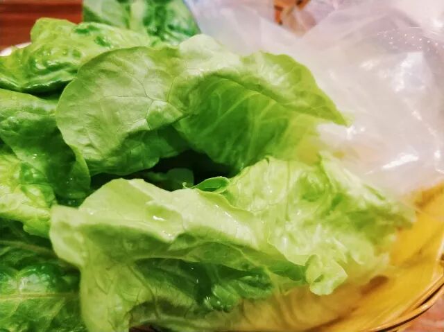 光吃五花肉会感觉有些肥腻,所以生菜就成为最好的解腻材料。在菜叶上放几片五花肉和配料,包裹后一起放入口中,菜肉均衡,口感十足。