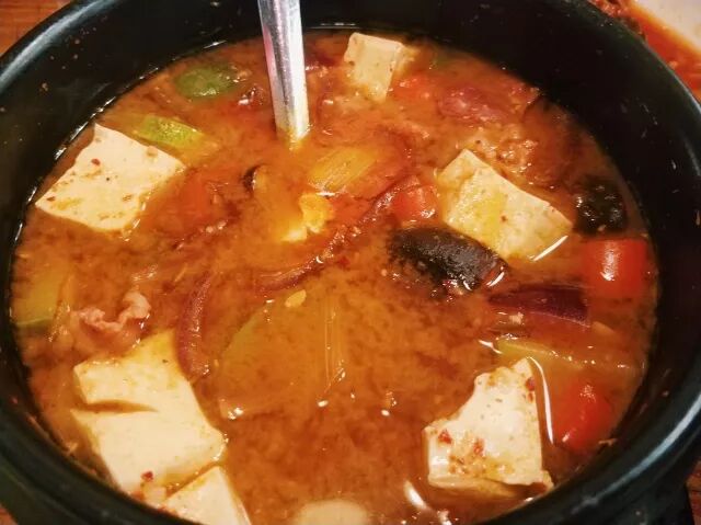 和海鲜嫩豆腐汤是同一种菜式,同样有豆腐。但是口感稍辣,材料有些不同,主要原料是大酱,将大酱和辣酱倒入水中烹煮成汤,汤底调制完成后再加入瓜类、香菇、番茄等。