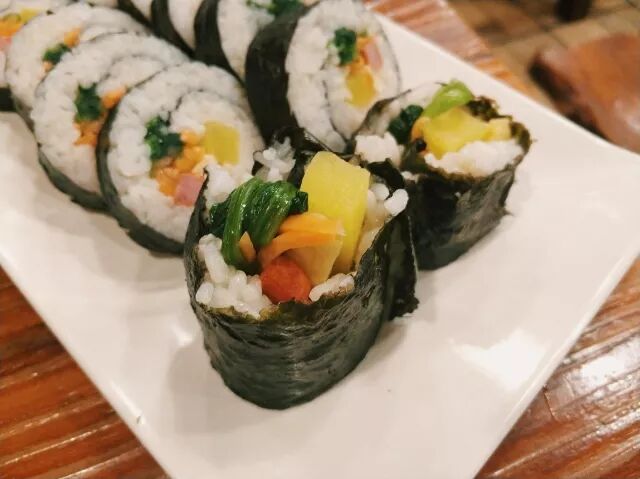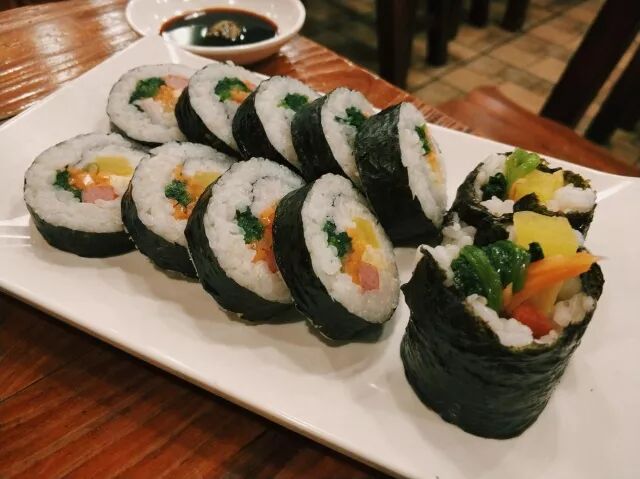 韩式紫菜包饭是由日本寿司演变而来,主要包裹着米饭、酸萝卜、菠菜、香肠、肉松、胡萝卜。很顶饱,吃了几块肚子就有些饱腹感。