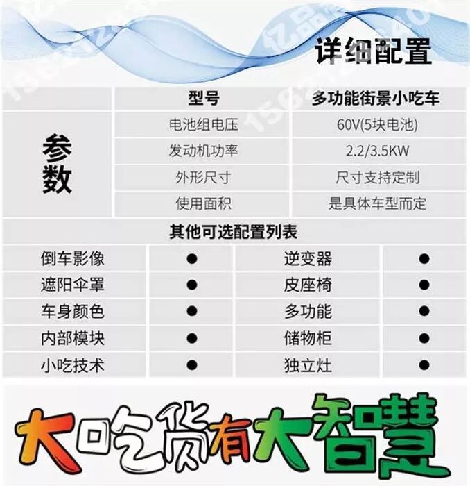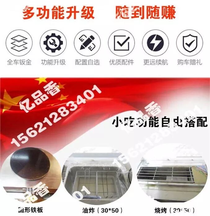 油炸、铁板烧、麻辣烫等许多小吃为一体,并且可以任意组合,该车设计美观制作精良,是中国中轻产品质量保障中心向各消费者、