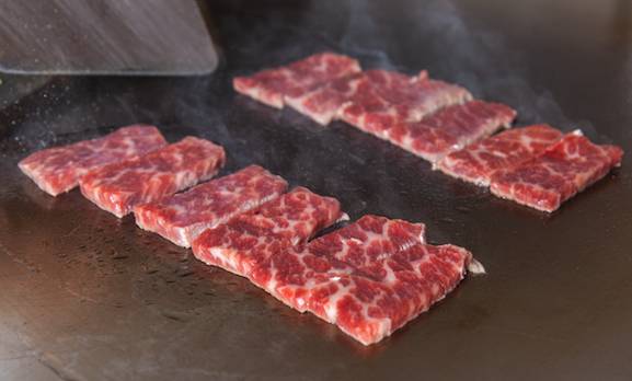 花纹像大理石一样的和牛才是正宗的雪花和牛,选取牛肋侧的嫩肉,切成0.5厘米左右的薄片,新鲜得一眼可见~