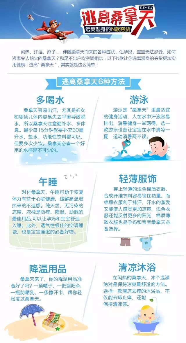 这样的桑拿天对于大人都受不了,何况对于孩子,又不可能整天让孩子只在空调房而不出门吧?那就要想应该如何既在出门的情况下又能让宝贝逃离桑拿天呢?