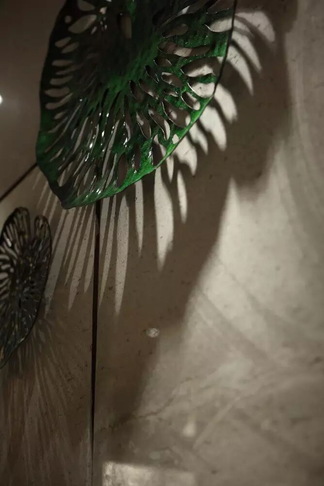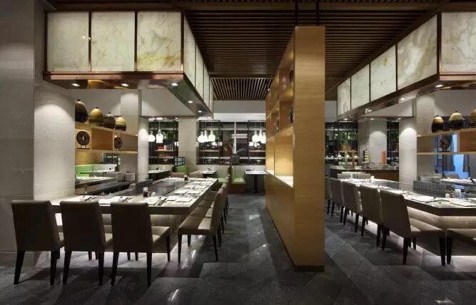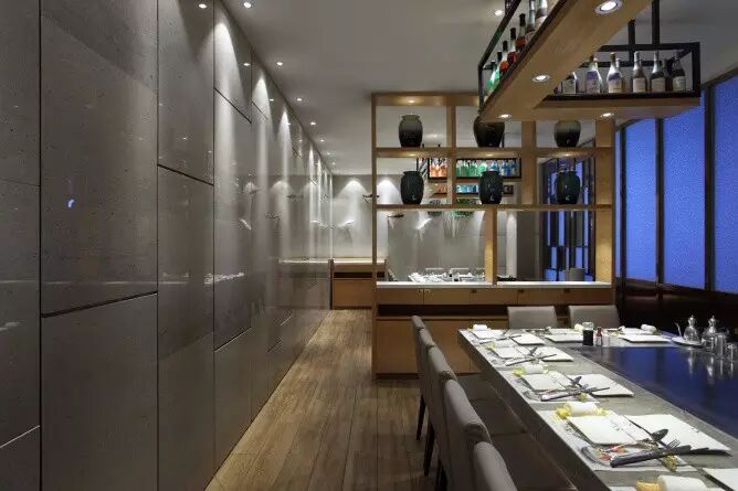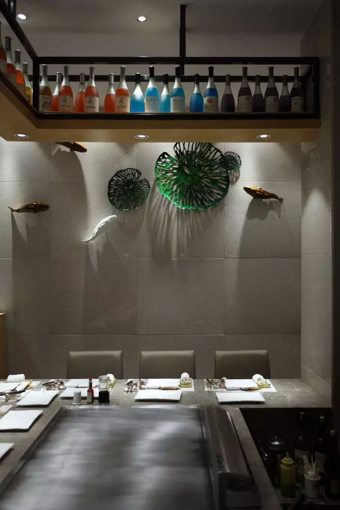 大渔铁板烧在延伸的屋檐下有条走廊,供纳凉或小憩。房间内部被拉门隔开,方便拉上和开启,这让看起来有限的空间显得很宽敞。不同于普通快销餐厅的用材,大渔选用石材,古铜镜钢,磨砂玻璃,营造的是简洁大气的风格,空间的亮点主要是在天花造型,透光板吊顶传承着铁板烧的传统文化。