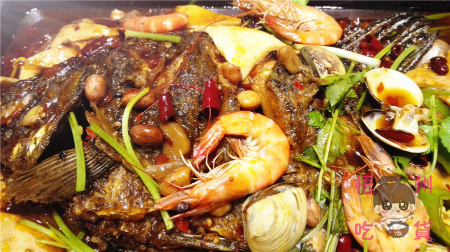 四川特色--火烧炉鱼! 一大盘的炉鱼,大概有3斤左右,加上其他海鲜,也只要68元。炉鱼类似于烤鱼,但是和烤鱼也是完全不一样的烹饪手法,炉鱼所用的炉,都是要特别定制的,温度更加均匀散布,这样的鱼不会焦,也会整条鱼保持一样的口感!