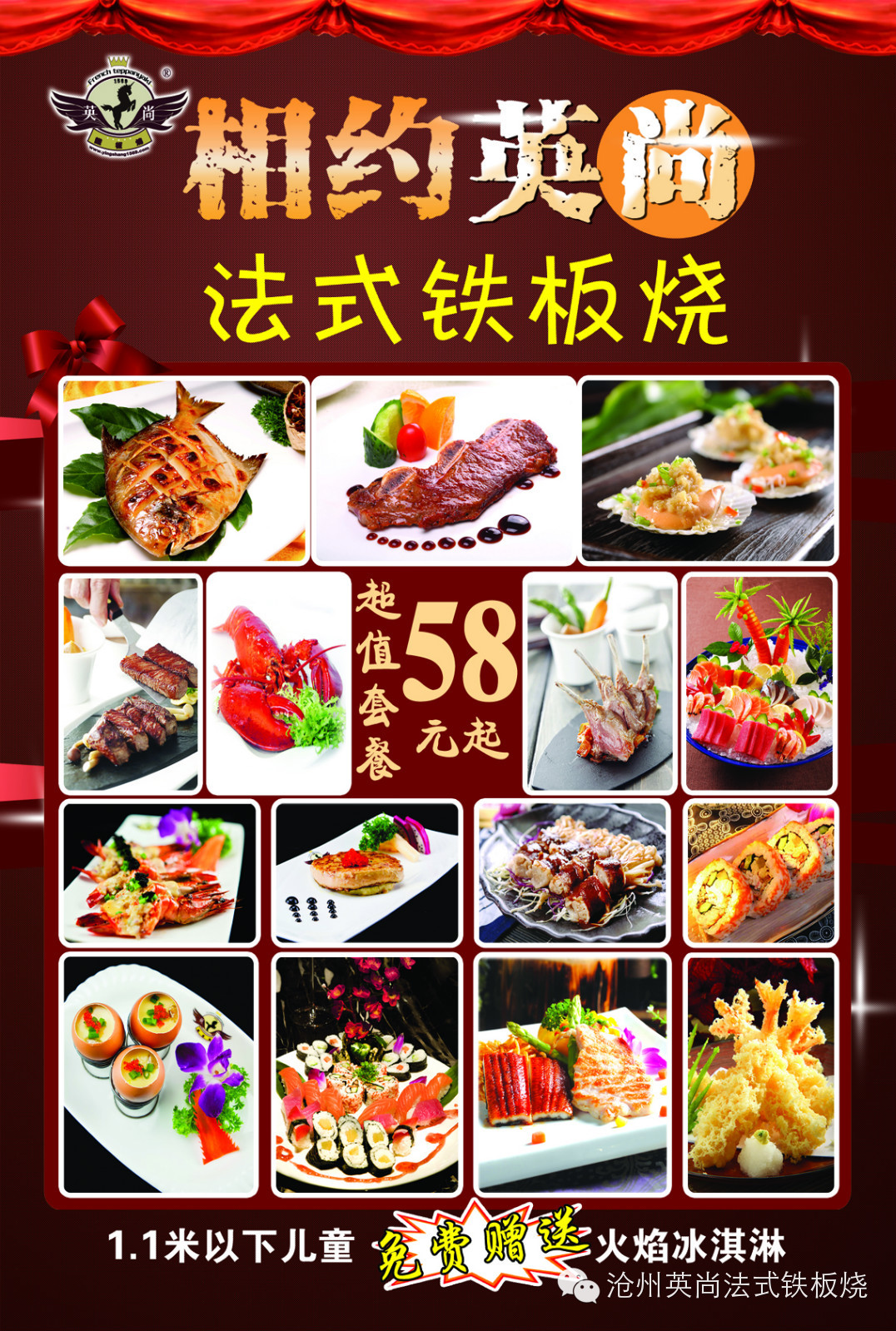 新鲜的食材,健康的理念,时尚的做法------英尚法式铁板烧,是您朋友聚会、家庭聚餐、商务宴请的理想场所!营养套餐五折起,最低只要¥58元哦~