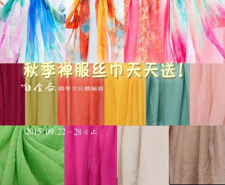 1)高端禅服低折扣奉献,凡购禅服者,现场送秋季丝巾1条,或国学书1本,或国学能量杯(小自在)1个;