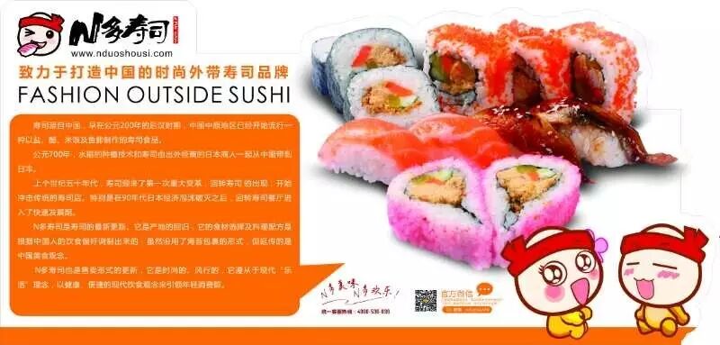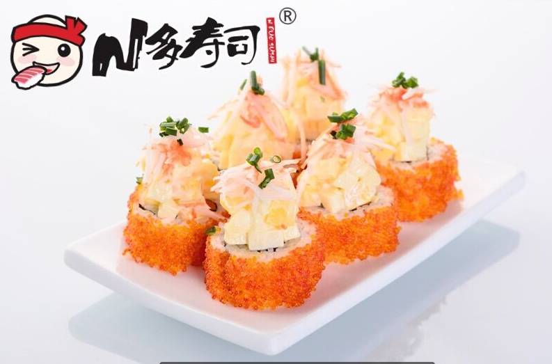 N多寿司相对于日式寿司,从食材、颜色、口味、营养、料理手法都更为丰富多彩,真正为中国人打造的寿司品牌。