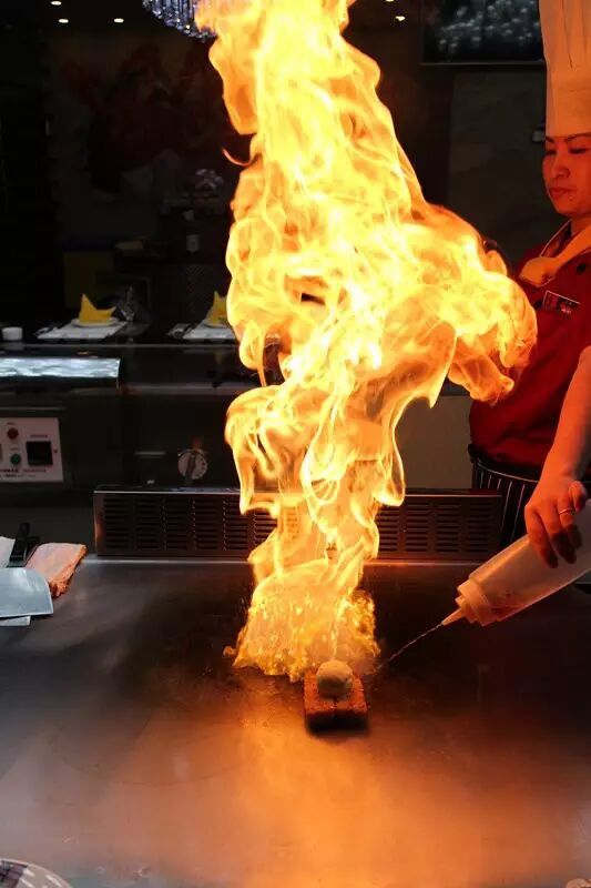 Duang~这才叫真正的Duang!感觉铁板烧都开挂啦!在煎制好的香蕉上面放上冰激凌球,以红酒为引,点燃火焰,红色的火焰迅速灼烧冰激凌球的表面。虽然只有短短的两三秒,冰与火的共舞,足以惊艳食客的眼睛。