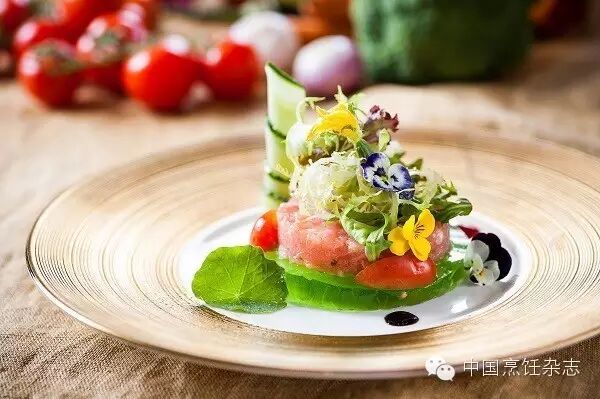 制法:金枪鱼切丁,用小葱碎、小洋葱碎、法香碎、橄榄油、柠檬汁、盐、胡椒粉、卡真粉和少许白酒拌匀,用模具定型待用;将鲜榨青苹果汁、罐装苹果汁以2:1的比例混合,加入融化的鱼胶片制成啫喱状,放入盘中,放上金枪鱼沙拉,点缀混合生菜、可食用花、迷你黄瓜、小番茄、黄瓜片,盘中点意大利浓缩黑香草醋、梅子汁即可。