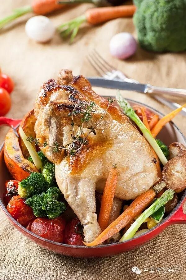 制法:将春鸡治净,用百里香、迷迭香、洋葱、胡萝卜、芹菜、盐、胡椒粉腌制24小时至入味,入烤箱以180℃烤约25分钟待用;将小西红柿洗净,表面抹上百里香碎、盐、胡椒粉、橄榄油,入烤箱以140℃烤10分钟;将小土豆洗净,对半切开,带皮放入牛奶中,加黄油、百里香、盐低温煮熟后,沥干,再用鸭油、迷迭香碎、百里香碎煎至出香味;南瓜洗净,改刀去瓤,入烤箱以140℃烤20分钟,取出;锅入橄榄油,加蒜、鼠尾草、百里香炒香,放入南瓜稍煎至入味;芦笋、西葫芦、西兰花、迷你胡萝卜分别用橄榄油、洋葱、蒜、盐煎熟;将以上制好的蔬菜摆入盛器,放上春鸡,点缀装盘即可。