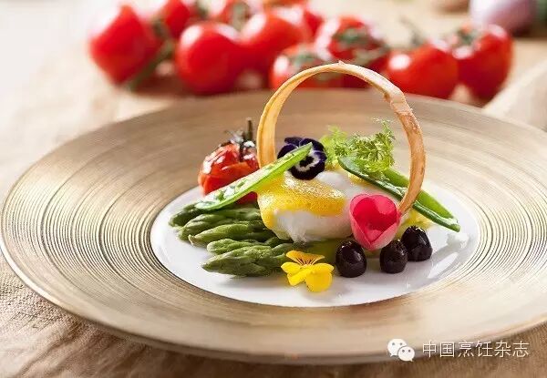 原料:春季芦笋,蜜豆,小番茄,意大利腌制橄榄,春卷皮,可食用花,橄榄油,盐,胡椒粉,藏红花沙司。