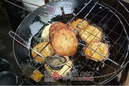 在融水的滤粉店门口大部分都会有现炸的铜瓢粑卖,融水人习惯用铜瓢粑配着米粉吃,吃的时候还可以加点摊上的青辣椒酸水,又香又脆,吃了还想吃!