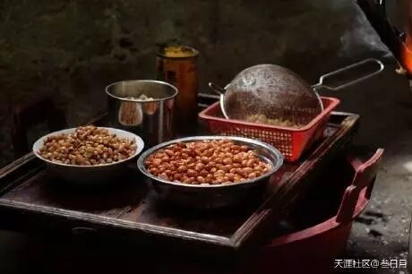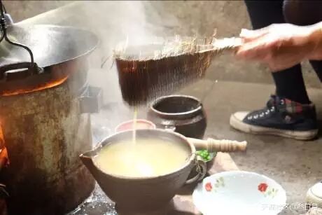 接着用木槌把茶叶舂碎,而所谓"打油茶"的"打"就是"舂"的意思。再用文火焖一下,使茶汁浓些,便滤出叶渣,放点葱花,油茶便算"打"好。
