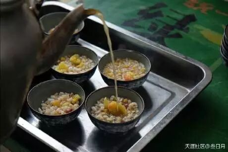临吃时,先取一小碗放入各种配吃的小食品,如爆米花、炒花生、炸黄豆、炒芝麻、糍粑、玉兰片等,然后舀滚热的茶汁冲进碗中即成,香甜美。
