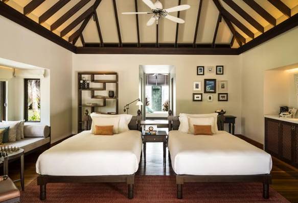 两间卧室皆通往宽敞的日光甲板,一家人可以在躺椅上休憩,在四面敞开的用餐亭中共享美食,或是在延展至白色柔软沙滩的大型无边泳池玩耍。