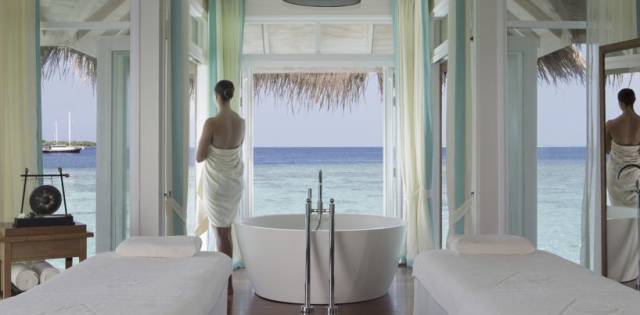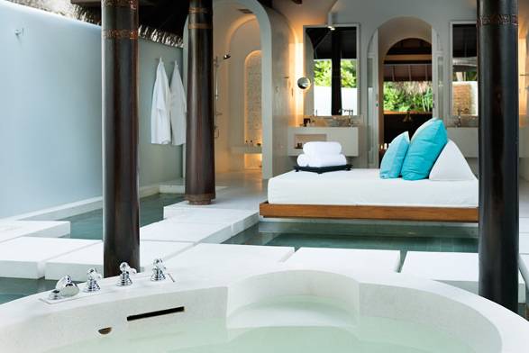 清晨醒来在床上享用早餐,看着太阳从一望无际波光粼粼的海面上徐徐升起。 浴室的尽头有个浅浅的池塘,沉浸在双人浴池中,仰望点点繁星。