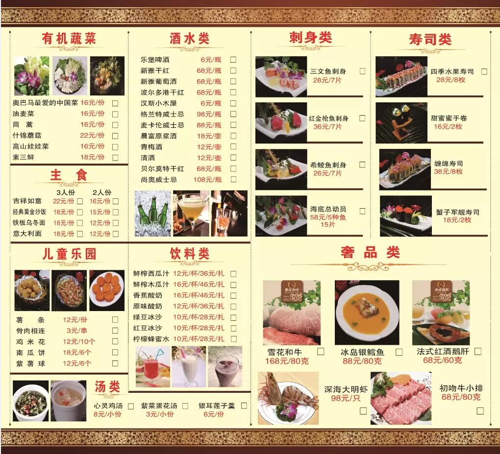 菜品丰富,极致美味!肉类、海鲜、寿司、时蔬、汤羹、沙拉、水果、酒饮百余种;菜品丰富,极致美味,无限畅饮,一单到底!