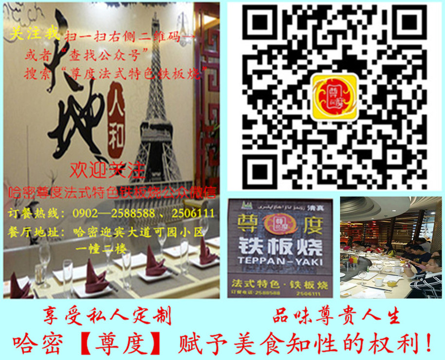 「哈密尊度法式特色铁板烧」结合中西餐饮文化,以铁板烧为平台,刀铲为道具,将厨房移动到您面前,用优质“绿色菜品”面对面为您烹饪菜肴!