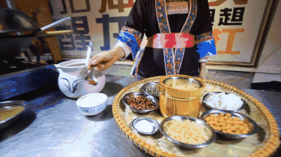 油茶的内容十分丰富,面筋、海带、豆皮丝、花生、芝麻,样样不可少。如果能用上母鸡炖的汤底就更加美味可口了。喝油茶的时候会加很多黑胡椒,吃完之后整个人由里到外透着一股暖劲儿,即便天气不冷,也会在油茶中加一些黑胡椒提味儿。