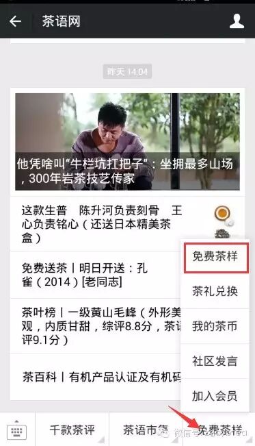 首先呢,你得先关注微信公众号“茶语网(zgcybtea)”;其次呢,你得点到茶语网的下拉菜单页面;最后呢,点出右下角的“免费茶样”菜单,接着再点击进入“免费茶样”页面。