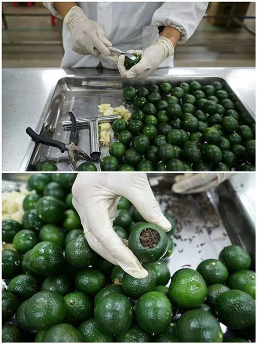 小青柑多用来制作青柑柑普茶。把小青柑开盖、挖肉,装入普洱茶底,陈化几年,就成为青柑柑普茶。