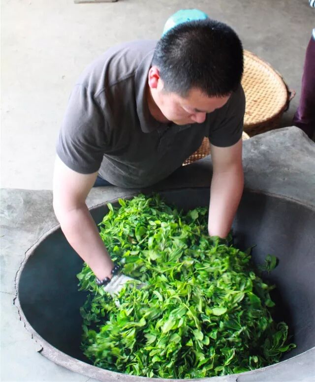 晾干的鲜叶在手工锅中杀青,双手在铁锅的翻炒,让每片鲜叶都带着手心的温度。在杀青之后,毛茶经过两次揉捻。初揉在茶叶杀青、摊晾后进行,揉至茶叶基本成条、茶汁渗出后,将茶叶晾至次日清晨,再进行复揉,以确保茶叶中较难揉成型的粗老枝叶也紧结成条索。这样制成的毛茶身骨结实沉重,色泽乌润有光,冲泡时汤色金黄,滋味浓郁饱满。