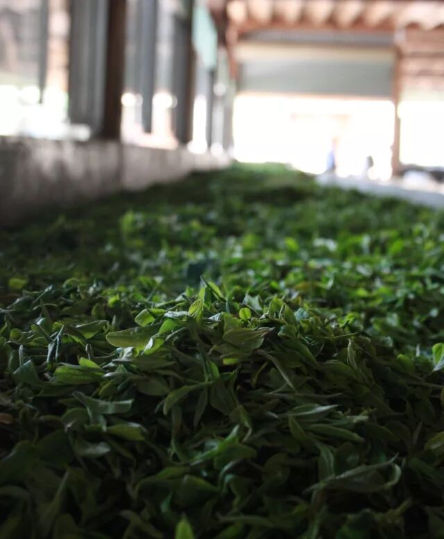 鲜叶离开母树生命还在继续,光合作用因为水分、养分的减少逐步减弱。 将鲜叶摊开挪放让呼吸作用继续进行,水分开始均匀地分散到叶片和叶梗的各个部分。这样的步骤虽然耗时,却能让鲜叶舒展有活力,有光泽,软硬适中。