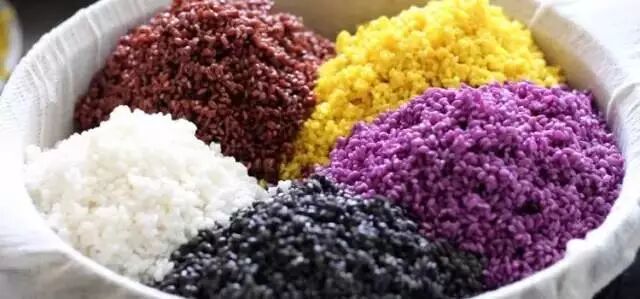 糯米饭呈黑、红、黄、白、紫5种色彩而得名,又称“乌饭”。每年农历三月初三或清明节时节制作食用,是吉祥如意、五谷丰登的象征。