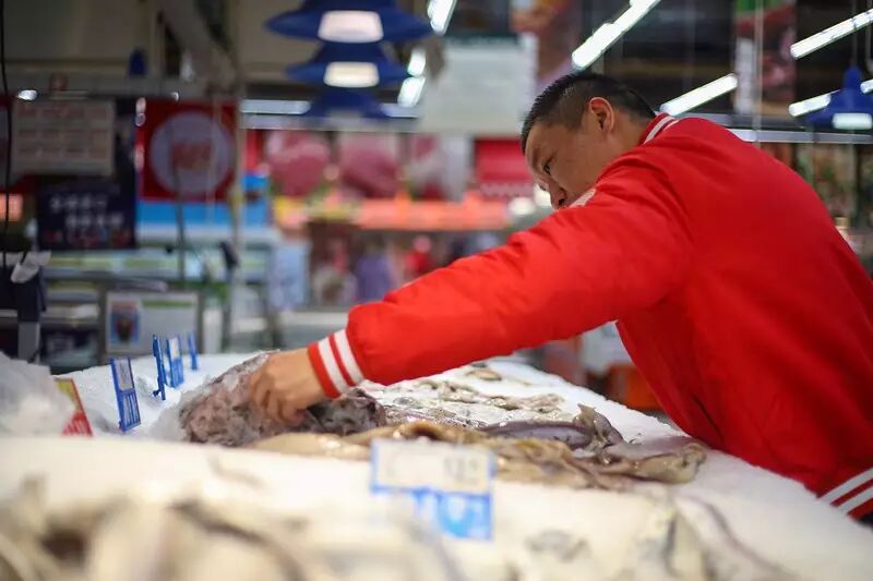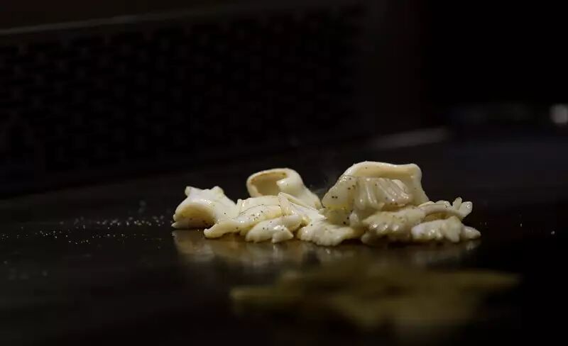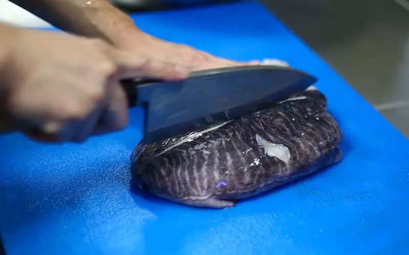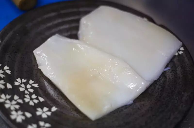 █比如要准备一小份墨鱼花原料,就要耗费一只大墨鱼。经过清洗、清理外皮内脏、切片等多个环节才能得到两块完整的墨鱼肉。随后,把墨鱼肉切成整齐的花形不仅需要足够的耐性,更需要精准的刀工。