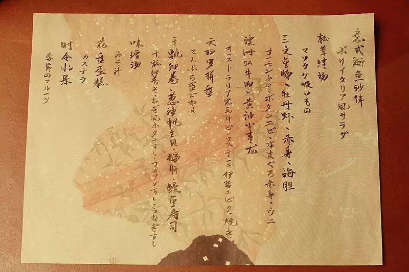 █在正式开始铁板烧料理之前,顾师傅会送上一份手写菜单,笔墨馨香更增添了些许的东方情调。