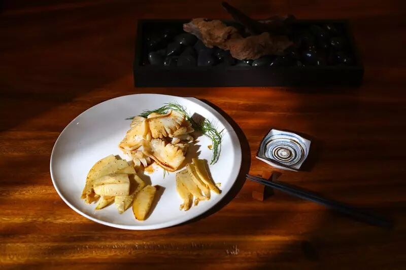 █鲜美的冬笋搭配上火候恰到好处的墨鱼花,看上去就如诗如画。加上少许盐粒和柠檬简单调味,便有非常自然的鲜美,这是人工味素无法企及的自然之味。