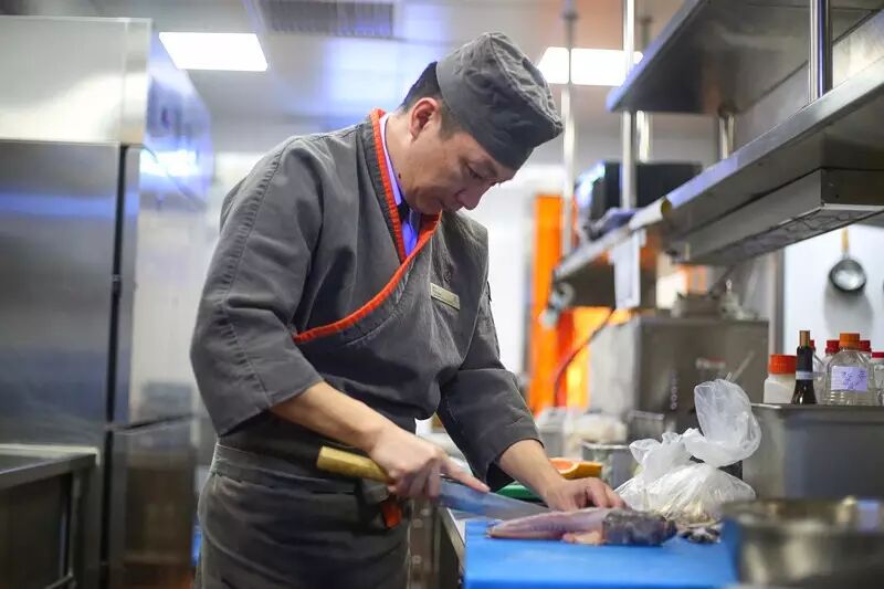 █顾师傅师承山田先生,是一位有着匠人精神的厨师。他说做料理需要恒心,需要一丝不苟的专注。因此对于食材的选择,他尤为挑剔。手臂长的大明虾、油花完美的澳洲和牛、肉质细腻的虎头鱼,食客舌尖惊艳的美食都来自于他对美食的执念。
