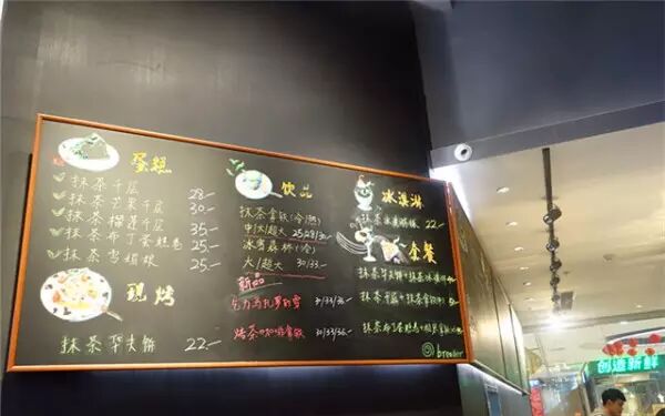 这家店,从名字到内饰,都是纯正的只做抹茶。一进去就被一股浓浓的茶香微醺到了,整个人心都宁静下来。不仅是小清新,更有一点禅意在里面。纵深的长排座椅,每个座位上都有一顶香薰,熏着茶叶香薰,温度让茶香蔓延。黑板上工工整整的写着菜单,十足的抹茶气息,从蛋糕到饮品到冰淇淋,全是抹茶元素,抹茶控爱疯了。