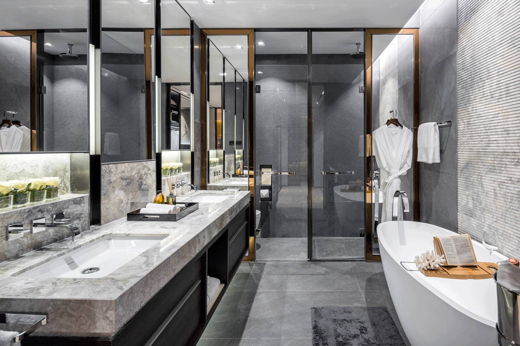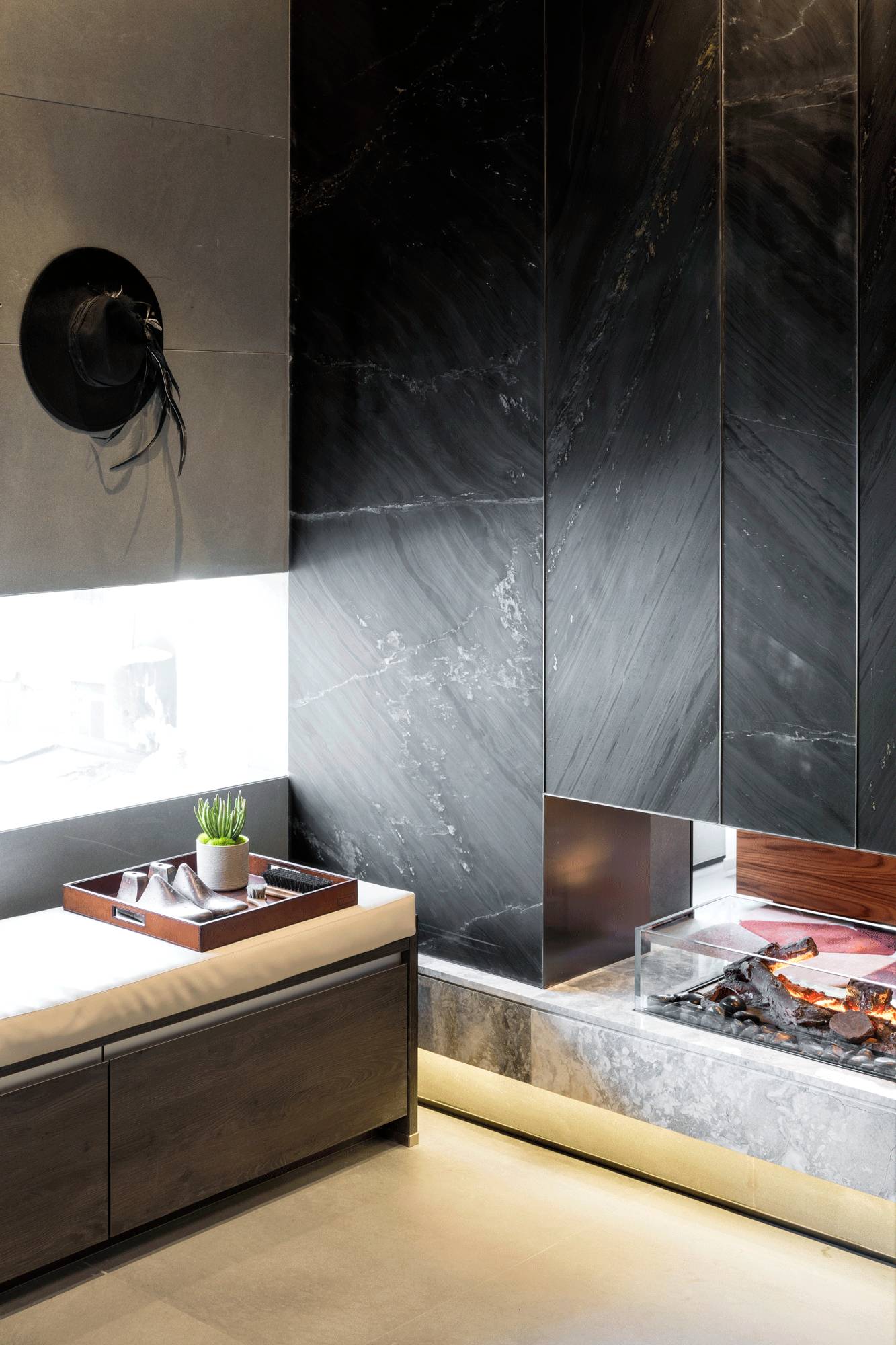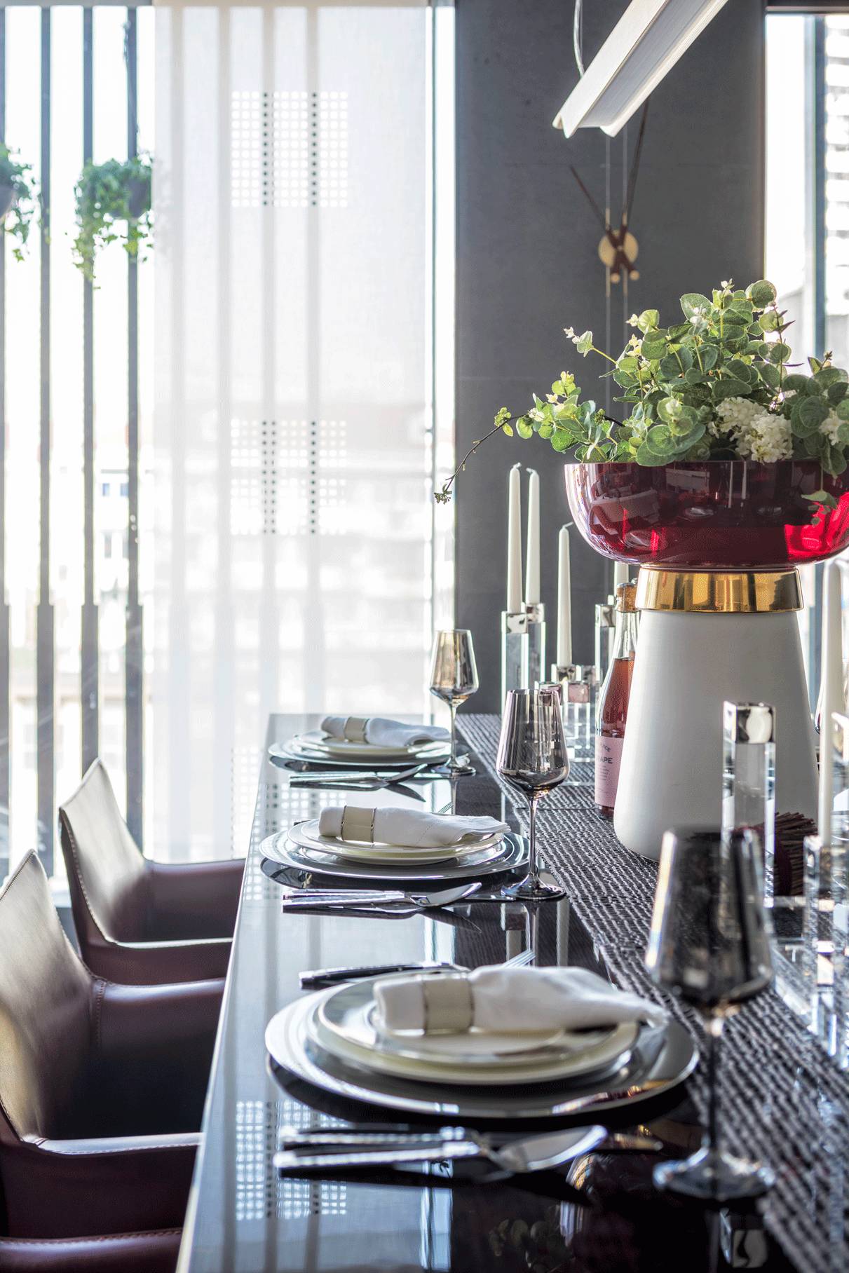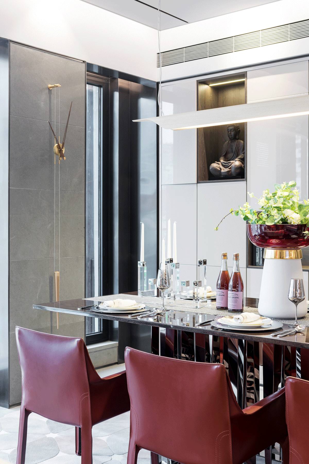 “重新回到客厅吧!”这是整个空间规划的核心,把客厅作为家庭生活的联结点,打开公共区域、规划不同功能,让家人从书房、厨房、卧室里都走出来,聚到了一起。刚至玄关,就能透过温暖的壁炉隐约看到客厅内的情形,会客区域与餐厅、西式厨房连成一片,自由开放的不仅是空间,更是视觉和心灵的感受。阅读工作区的设计很特别,,把移动办公的男主人和负责烹饪的女主人巧妙地安排在了同一空间内,这是相互欣赏,更是快乐分享。而这里的空间也不仅仅只是看到的功能,而是通过一些细节的设计让其在不同时段展现不同的生活情趣。在西厨内,配合特别设计的小超市,白天,这里是厨房的一部分,还是阳光早餐、惬意下午茶的主要阵地,晚上则呈现出酒吧的概念,在灯光的营造下充满了浪漫的氛围。不同情境下同一场景呈现出的不同形态,让居者感受的是充满变化的情趣感,也让人更愿意在这里长时间停留,重新找回在一起的感觉。