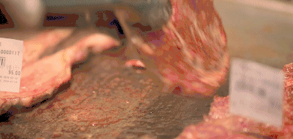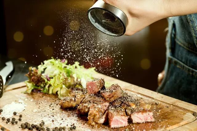 分切时,店员手脚麻利的将牛排分切成块,并用黑胡椒和玫瑰海盐调味。