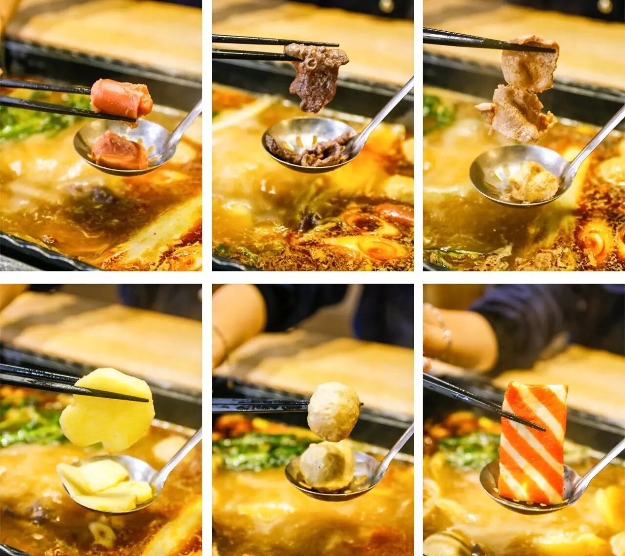 火锅必备食材:牛肉丸、肠仔、牛肉、土豆等。
