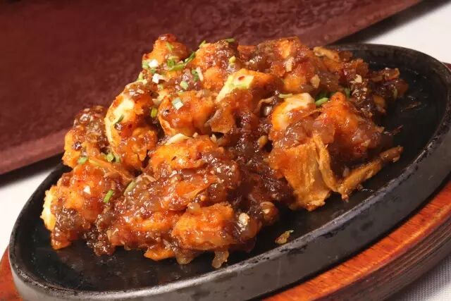 1、把银鳕鱼切成骨牌片后,拖匀脆浆糊,再放入热油锅里炸熟,捞出来摆放在烧热的铁板上,待用。