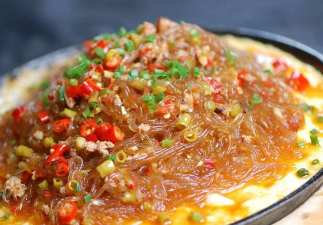 水晶粉用60度温水泡开,红小米椒、野山椒剁碎 ,锅热入油,煸香肉泥,下人 红小米椒、野山椒、蒜末 炒香,淋入高汤,烧开入水晶粉,下入所有调料调味,收干汤汁,入葱花即可。