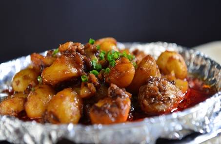 这道菜的通常做法是先炒馍,再加凉粉块炒至入味,周百狮却将顺序颠倒,先下凉粉炒至软烂后,再下馍块裹匀凉粉,出锅倒在烧热的铁板上,成菜咸香入味,紧贴着铁板的馍上桌没一会就结成了锅巴,香酥可口。