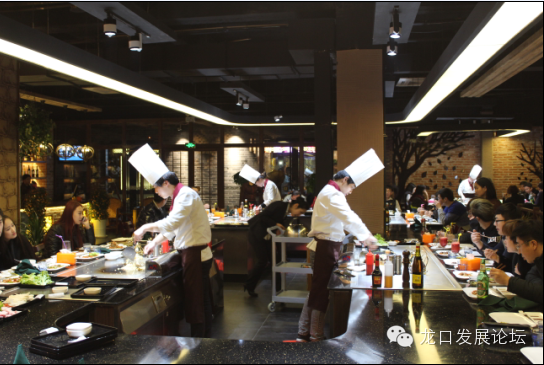 铁板烧是一种西餐和中餐相结合的餐饮方式。铁板烧的原理是以一块大铁板把食物加热,由厨师在铁板上烧烤及处理各种食材。它把厨房搬到外面,和客人进行交流,让客人在进餐的同时能够欣赏到厨师的厨艺。