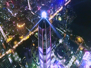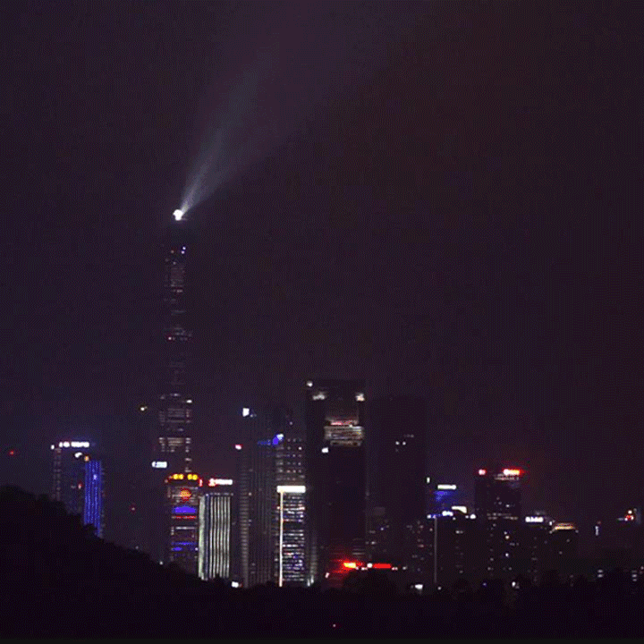 被称作“钻石顶”的塔尖熠熠生辉,仿佛夜空中的耀眼星辰;数道光柱从楼顶射出,直透云层,照亮城市天际;圣诞祝语浮现在大楼外立面升至600米高空,向每一位深圳市民传达。